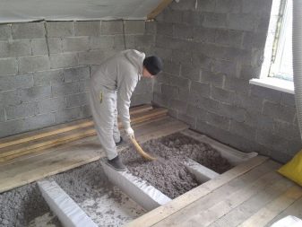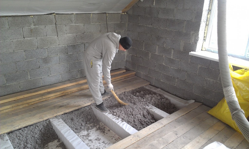 Nicht sehr häufige Art der Isolierung, die aus einer Mischung von flüssigem Glas, Zementpulver und Holzwolle hergestellt wird. Dieses Material behält Wärme gut und hat hohe Schalldämmeigenschaften. Aufgrund ihrer Hygroskopizität eignet sich eine solche Isolierung nicht zum Verlegen von Böden auf dem Boden, aber sie ist ideal für Fußböden durch Balken. Um den Boden des ersten Stocks zu isolieren, ist er mit einer Schicht von 15 cm bedeckt, der zweite - 10 cm.