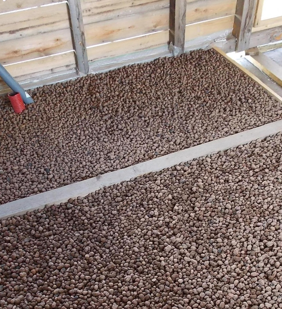Material mit hohen Festigkeits- und Wärmedämmeigenschaften. Blähton eignet sich für einen gleichmäßigen Bodenbelag. Um eine optimale Wärmedämmung von Blähton zu gewährleisten, muss eine Schicht von mindestens 15 cm verlegt werden.Der Komfort dieses Materials liegt auch in der Tatsache, dass Sie alle notwendigen Verbindungen darin verlegen können. Blähton ist ziemlich hygroskopisch, daher sollten Sie vor dem Einsatz auf dem Boden unbedingt Wasserschutzmaßnahmen durchführen.