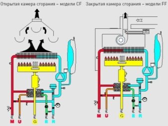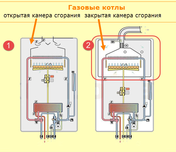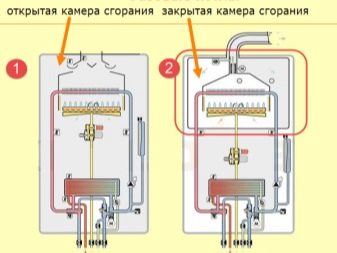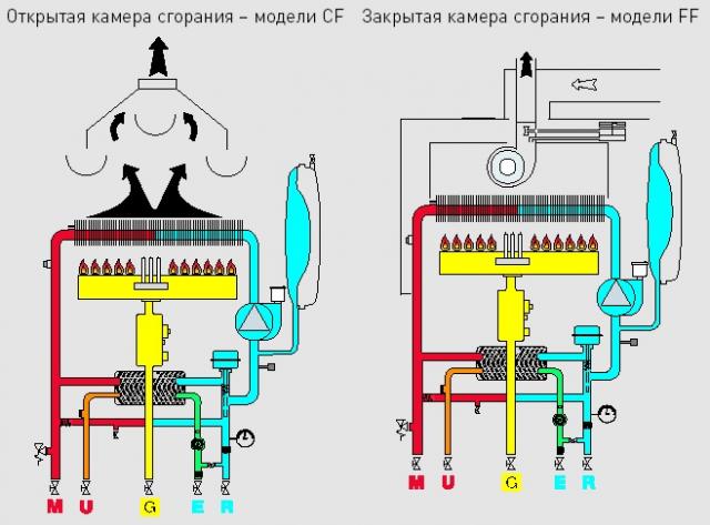 - Mit einer offenen Brennkammer. Eine solche Heizeinrichtung ist durch Arbeiten aufgrund natürlichen Zuges gekennzeichnet. Die Luftzufuhr in einem solchen Kessel erfolgt aus dem Raum, und die Verbrennungsprodukte werden durch den Schornstein geleitet.