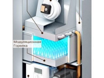 - Modulationsgerät. Die Leistung solcher Geräte wird von einer Mikroprozessorelektronik von 10 bis 100% geregelt. Die Intensität des Verbrennungsprozesses variiert in Abhängigkeit von den Parametern des Heizsystems.