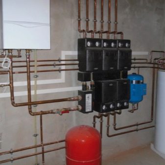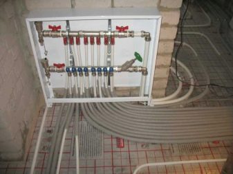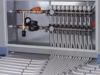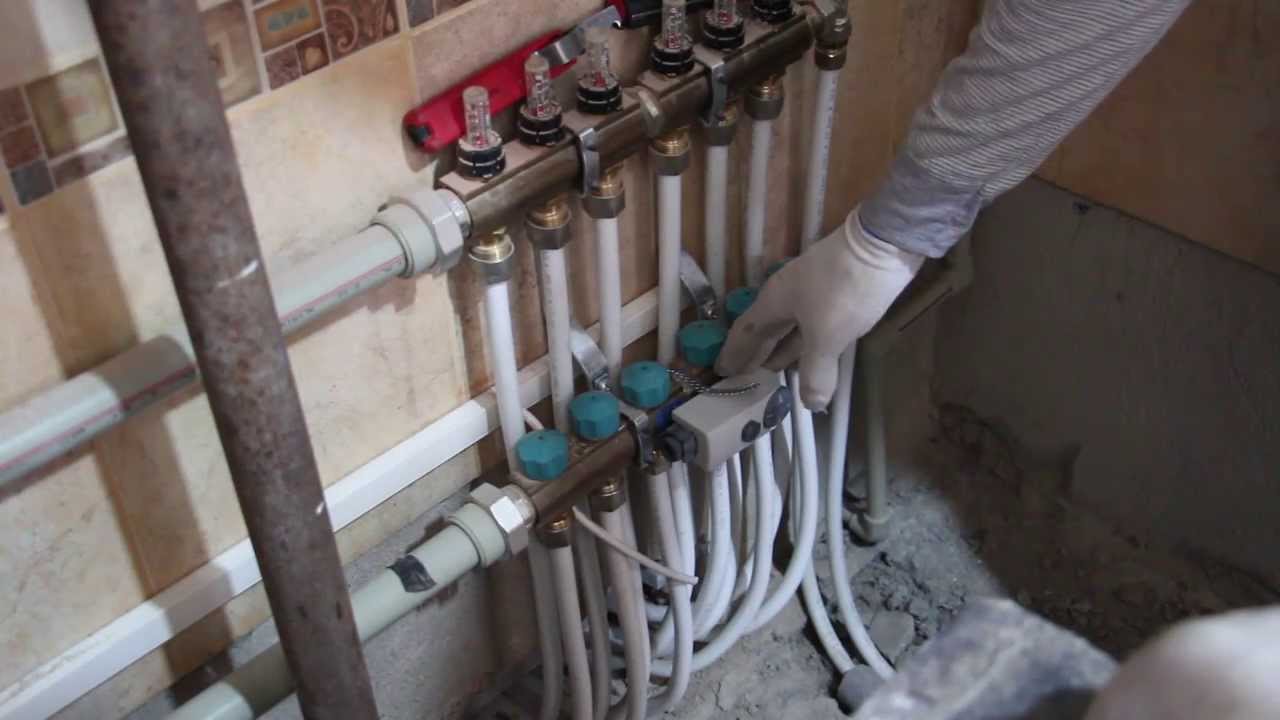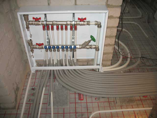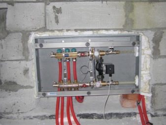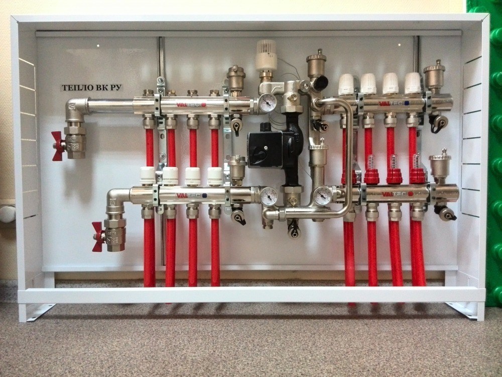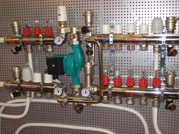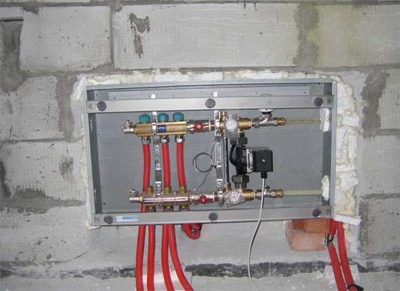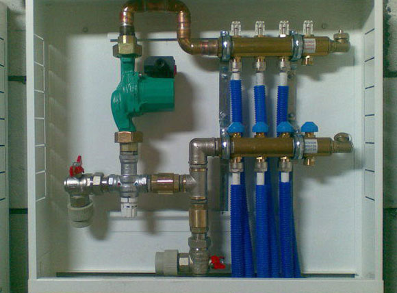 Die Grundlage dieser Methode ist die Verbindung von Kessel, Verteilern und Rohren. Der Standort des Kollektorschranks sollte günstig sein: Sie müssen Rücklauf und Durchfluss mitbringen. Aber zuerst müssen Sie die Ventile an den Kollektoren installieren. Es kann ein Thermometer enthalten, um die Temperatur zu visualisieren.