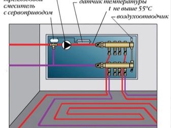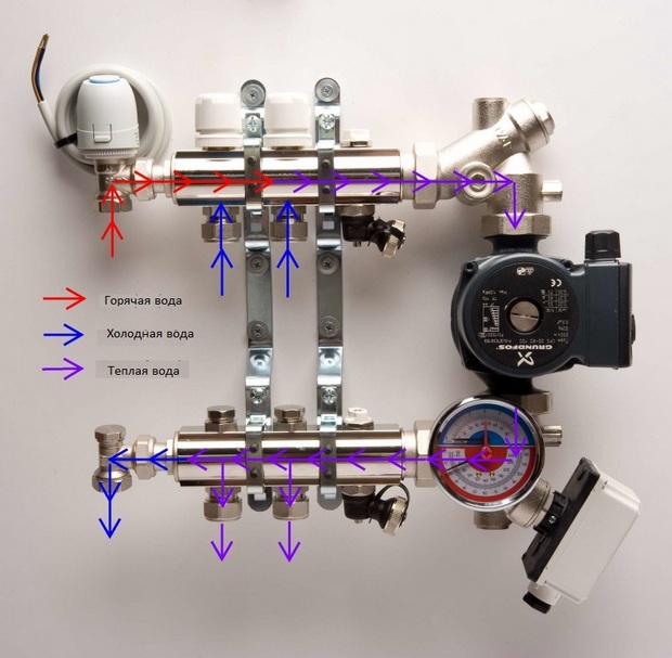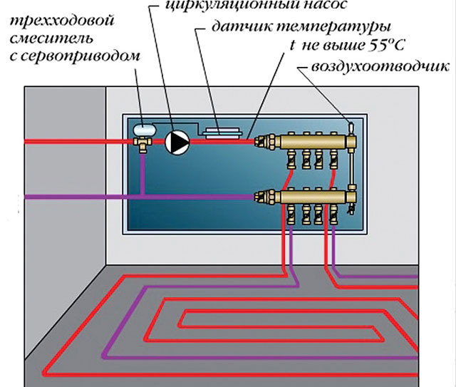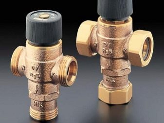 In der Praxis findet man häufig den Austausch von Ventilen am Einlass und Auslass gegen regelbare Thermostatventile. Dank ihnen ist es möglich, den Durchsatz dank der in ihnen installierten Thermoballs zu regulieren. Das Dreiwegeventil ist verantwortlich für die Mischung des Rückflusses und der Zufuhr, die notwendig ist, um die Temperatur des Wassers zu reduzieren, das auf dem warmen Boden zirkuliert, der entlang der Holzbalken verlegt werden kann.