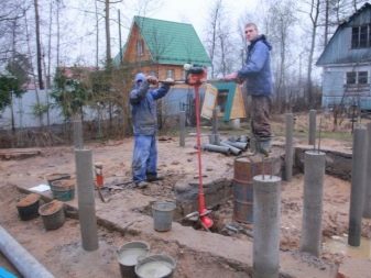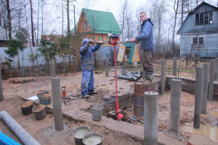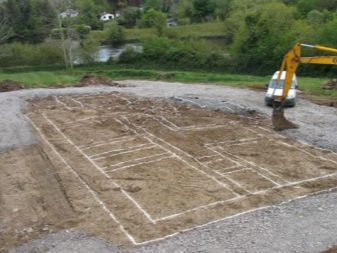 Der Arbeitsprozess beginnt nicht mit der Vorbereitung einer Gruppe von Tafeln, sondern mit der Auswahl des Ortes, an dem die Arbeit durchgeführt wird. Die Art der Gründung wird durch die Art und Weise bestimmt, wie die Garage betrieben wird - für einen Personenkraftwagen genügt die einfachste Streifenbasis. Die Baustelle ist vorgeräumt und hat einen Graben ausgegraben, gefüllt mit einer Mischung aus Sand und Schotter (im Verhältnis 1: 1). Danach kommt die Einführung von Pfählen und Betonieren - und wenn die gefüllte Lösung aushärtet, kann man am Rahmen arbeiten.