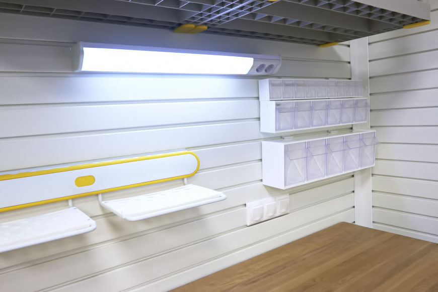 - Die Geräte werden am besten in den Rillen platziert, um Platz zu sparen.