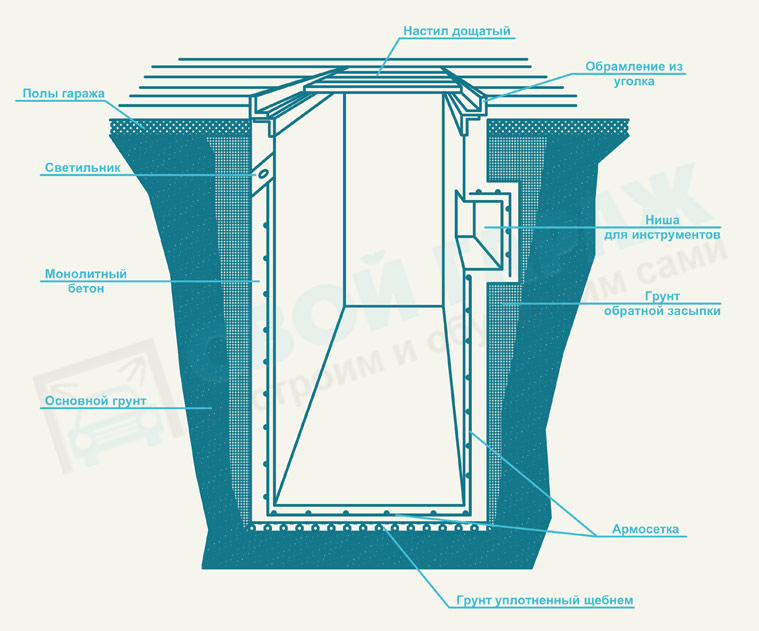 Wenn sich in Ihrem "Wohnmobil" ein Keller oder eine Beobachtungsgrube befindet, müssen Sie auch Licht installieren. Sicherlich hatten Sie Situationen, in denen ein Werkzeug oder ein Teil in diese Grube fiel. Zustimmen, um es im Dunkeln oder mit einer Taschenlampe zu suchen, ist nicht sehr praktisch. Es ist besser, wenn diese Zone individuell beleuchtet wird, aber bedenken Sie, dass hier die erhöhte Luftfeuchtigkeit ein negativer Faktor für Beleuchtungsgeräte ist.