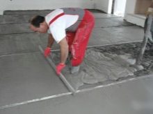 Der nächste Schritt ist die Installation von Beacons, die nach Level erfolgt. Dies macht den Boden glatt. Dann wird eine Betonlösung vorbereitet und auf den Boden gegossen. Seine Komponenten sind sehr einfach und weit verbreitet. Es ist gewöhnlich Sand, Zement und Schotter, deren Proportionen 2: 1: 3 sind jeweils.Alles ist mit Wasser gefüllt, um eine Lösung mittlerer Dicke zu erhalten. Um die Arbeit zu erleichtern, können Sie einen Betonmischer verwenden.