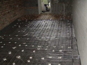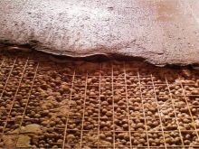Dafür Der erste Schritt besteht darin, den Boden mit Sand und Geröll zu ebnen. Dann wird eine wasserabweisende Schicht aufgetragen. Für diese Zwecke geeignetes Dachmaterial. Es muss überlappend verlegt werden, damit die Feuchtigkeit der Betonlösung nicht in den Boden gelangen kann. Auf dem Ruberoid können Sie ein verstärkendes Netz für einen dauerhafteren Estrich anbringen.