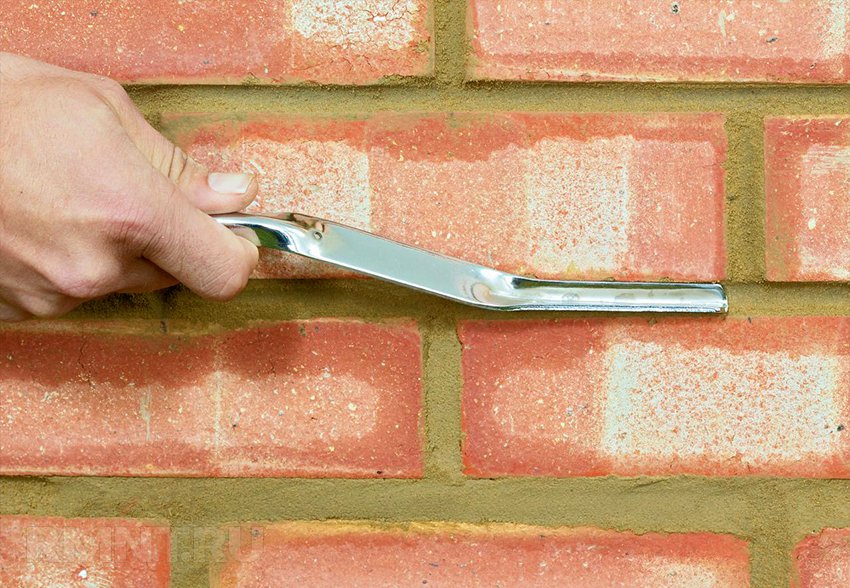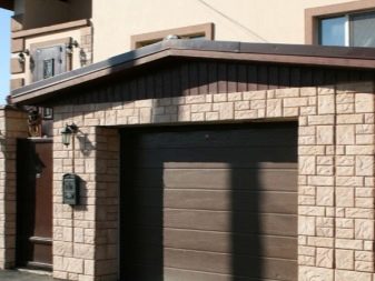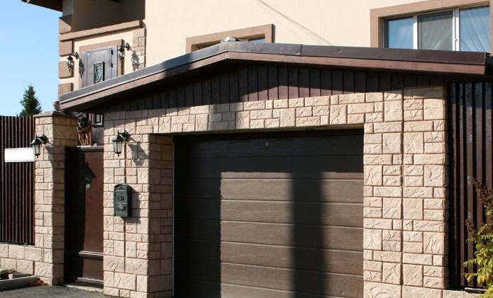 Es gibt viele Möglichkeiten, die Fassade des Garagenraums abzudecken. Am gebräuchlichsten sind Verkleidungen, Holzverkleidungen, Sandwichelemente.. Auch für die Nachbearbeitung der Außenseite wird oft ein solches Verfahren wie eine Gelenkverbindung verwendet. Es ist eine der preiswerten Optionen. Für den Kontrast können Sie verschiedene Farben der Mischung verwenden. Diese Methode verleiht dem Mauerwerk zusätzliche Stärke.