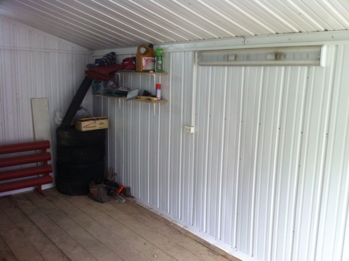 Auch zum Beschichten von Garagenplatz können Sie Kunststoffplatten verwenden. Sie sehen gut aus an Wänden und Decken. Der Boden ist gefliest, wobei der Farbton einen Kontrast zur weißen Farbe der Paneele bildet. Geschlossene Platte der Kontrollgrube für Sicherheit. An der zentralen Wand gibt es Regale für die notwendigen Werkzeuge und an den Seitenwänden Räder.Diese Garage ist nicht nur praktisch, sondern sieht auch wunderschön aus.