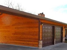 - Garage für zwei Autos 7x13 Meter mit einer Wohnetage und einem Wirtschaftsblock. Für dieses Gebäude wurde ein monolithisches Fundament und Wände aus Schaumstoffblöcken mit einer Dicke von 2 cm verwendet. Und die Wände haben eine Isolierung. Das Dach ist Giebel mit einem Neigungswinkel von 25 Grad. Da das Dach aus Metall ist. Die Wände sind mit Holzimitat dekoriert, was sie komfortabler macht. Tore in dieser Garage werden automatisch gerollt. In diesem Projekt nimmt die Garage eine kleinere Fläche ein als eine Wohnetage mit einem Versorgungsteil. Es ist kompakt mit einer komfortablen Fahrt gemacht. Der Zugang zum Haushalt direkt aus der Garage fehlt. Von außen ist es jedoch mit einem Visier bedeckt, das über dem ersten Stock hängt, wo sich der Haushaltsteil befindet. Die Wohnetage wird zweiter gemacht.