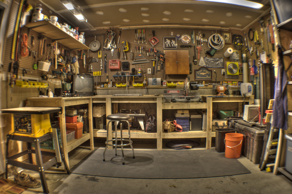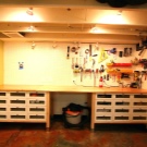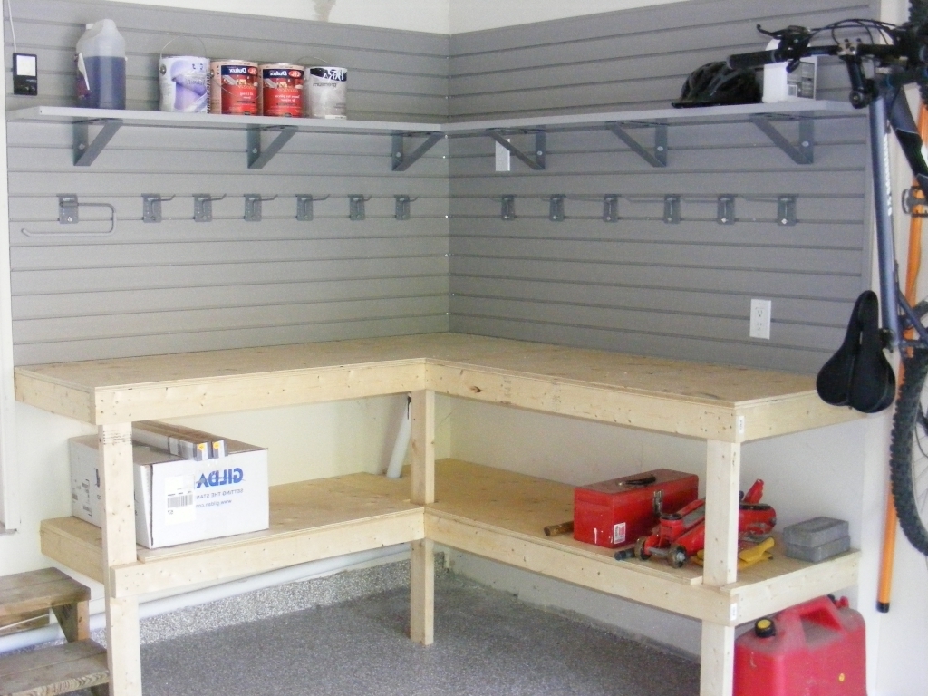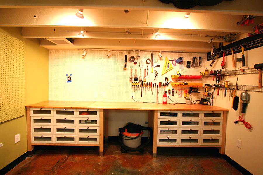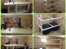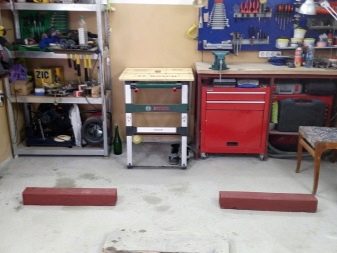 Für die Lagerung von Reifen und Rädern ist es besser, ein Regal aus einer Ecke zu bauen, die ein solches Gewicht tragen kann und dabei hilft, diese Gegenstände in Ordnung zu halten. Werkbänke sollten separat aufgestellt und nicht aufgeständert werden - das ist ein Arbeitsbereich, der immer einsatzbereit sein sollte. Für Schleifer und andere Elektrowerkzeuge können Sie Schubladen machen, in denen solche Dinge aufbewahrt werden, ist sicherer.
