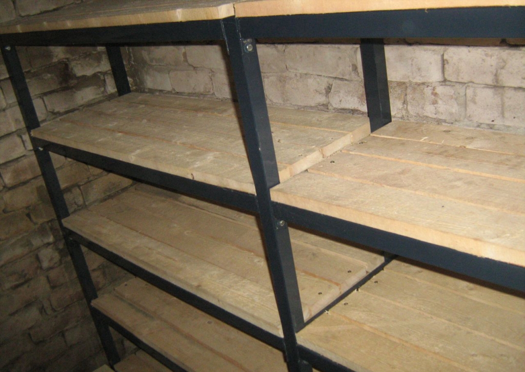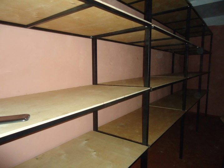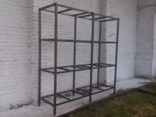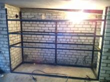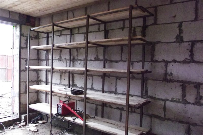 Wenn der Rahmen für das Rack hergestellt wird, ist es wichtig, die Regale bequem zu verwenden, sie können aus Brettern, PVC, OSB und Sperrholz bestehen. Wenn es möglich ist, ein dünnes Metall zu verwenden, wird es mit der Basis um den Umfang herum verschweißt. Wenn etwas Schweres oder Großes im Regal gelagert wird, ist es wichtig, den Rahmen selbst zu verstärken und ein solides Regal zu nehmen. Für den Rahmen verwendeter Winkel oder geformtes Rohr. Die Regale selbst müssen mindestens zwei Zentimeter dick sein.