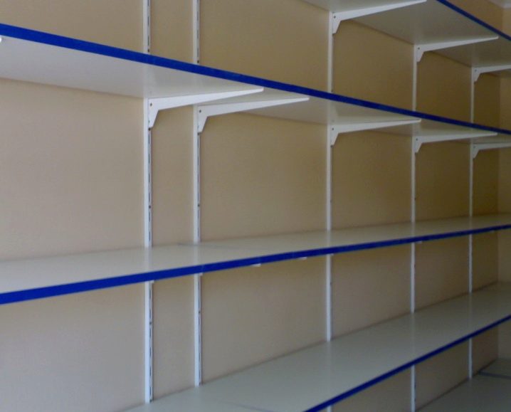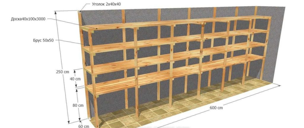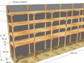 Wie für die Regale aus Holz unterscheiden sich die Größen leicht, aber hat seine eigenen Eigenschaften.Die Länge der gesamten Struktur mit geeigneten Stützen kann bis zu sechs Meter betragen, was vorteilhaft ist. Das untere Regal sollte vom Boden auf eine Höhe von 80 cm angehoben werden, und der Abstand zwischen allen Regalen vom Boden bis zur Decke beträgt 40 cm. Sie können mehrstufige Regale bauen, um kleine und allgemeine Dinge an ihren Plätzen zu platzieren.