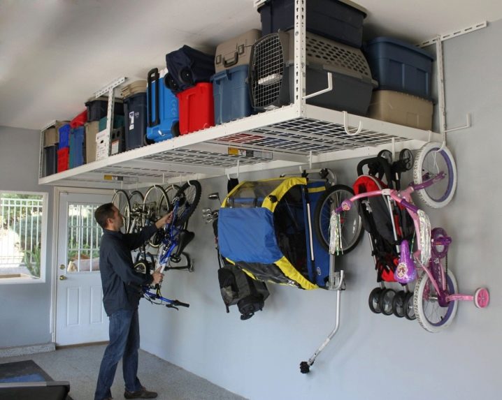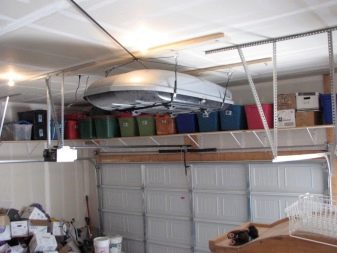 Deckenregale sind praktisch für jene Räume, wo der untere Teil der Garage frei sein sollte, nicht mit verschiedenen Gegenständen überladen. Das Design solcher Regale kann unterschiedlich sein, ebenso wie das Material. Wenn es Metall ist, dann können die Basen die Form eines Quadrats haben, auf dem Regale angebracht werden, jede Ecke wird entweder an der Wand oder an einer gemeinsamen Basis befestigt.