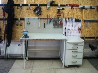 Für unterschiedliche Aufgaben müssen unterschiedliche Materialien und Komponenten verwendet werden. Wenn in der Garage ein Arbeitsbereich vorhanden ist, sollte eine modulare Wand mit Regalen einen Tisch haben. Bequeme Wandregale ermöglichen es Ihnen, alle benötigten Materialien schnell zur Hand zu haben.