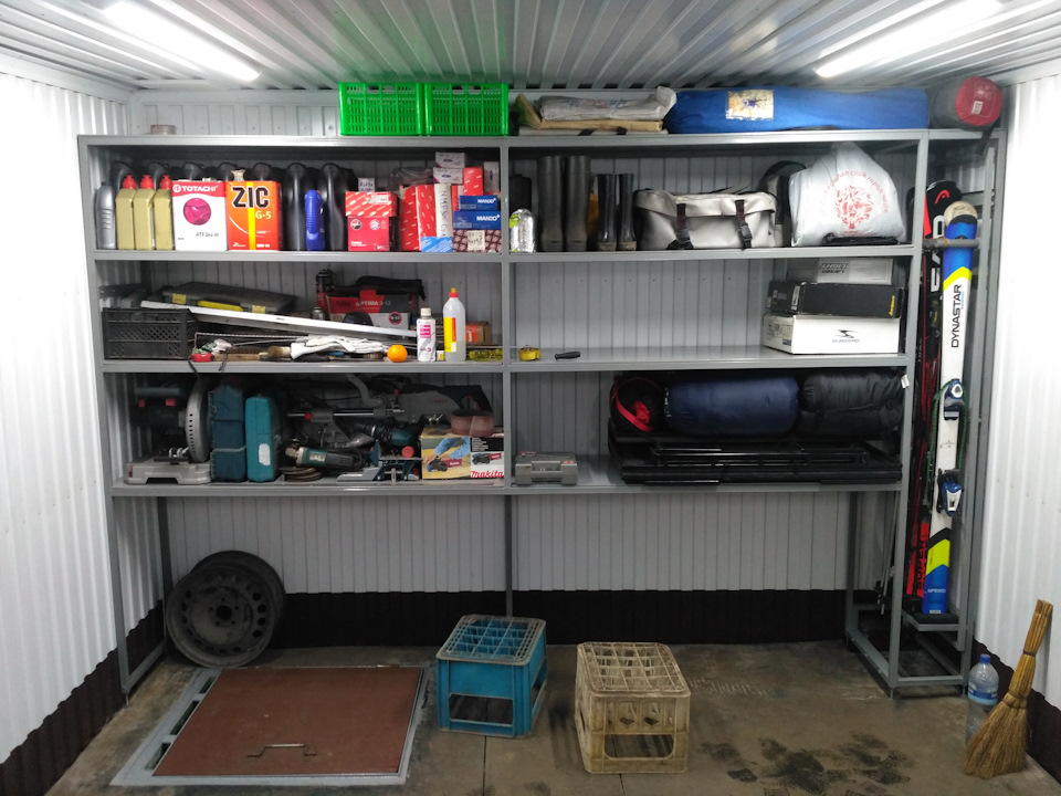 Die Regale an der Unterseite haben eine große Höhe, um die gesamten Dinge, wie die Räder des Autos, und große und schwere Teile unterzubringen. Die oberen Regale, im Gegenteil, es ist besser, kleine, nicht schwere und kleine Gegenstände gut auf ihnen zu machen.
