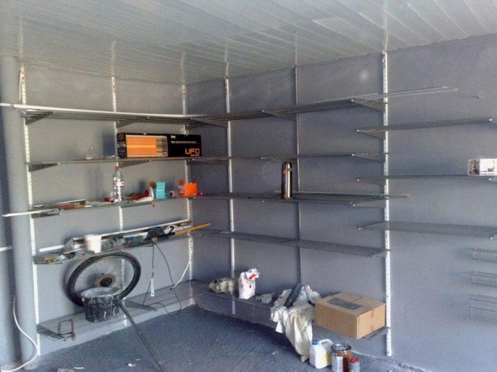 Die Verwendung von hängenden Regalen ist praktisch, wenn der untere Teil der Garage frei sein sollte, um die Ankunft des Autos oder aus einem anderen Grund nicht zu stören. Es ist wichtig, dass das Design dieser Art überwiegend aus Metall besteht, da es starken Belastungen standhalten muss.Die Wände der Garage müssen aus Ziegeln sein, sonst ist es nicht möglich, die Regale darauf zu befestigen.