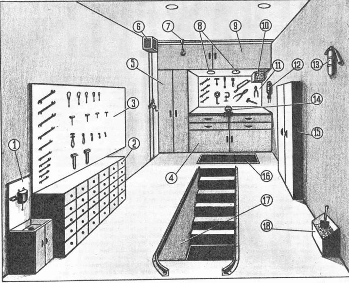 Für die Auswahl der Größe zukünftiger Möbel ist es wichtig, einen Entwurf der Garage mit den exakten Abmessungen zu zeichnen und alles auf Papier zu platzieren, wie Sie es in der Realität sehen möchten.