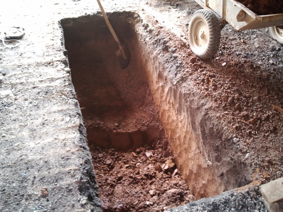 Danach können Sie mit Erdarbeiten fortfahren. Sie können Gräben entweder manuell oder mit einem Minibagger graben, wenn Sie einen haben. Sofort müssen Sie einen Platz unter der Inspektionsgrube vorbereiten, wenn es notwendig ist.Seine Tiefe sollte ungefähr zwei Meter betragen, obwohl diese Zahl variieren kann.