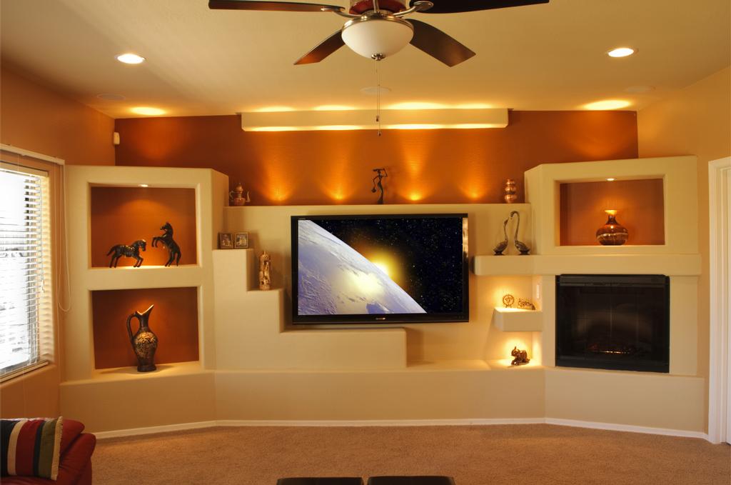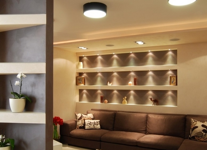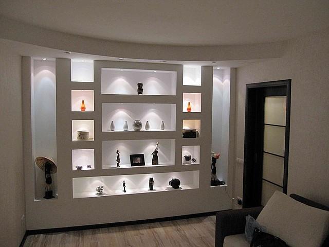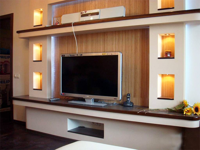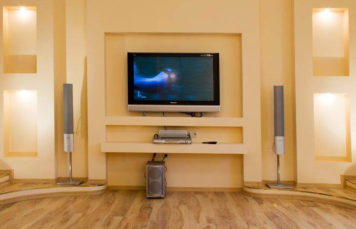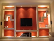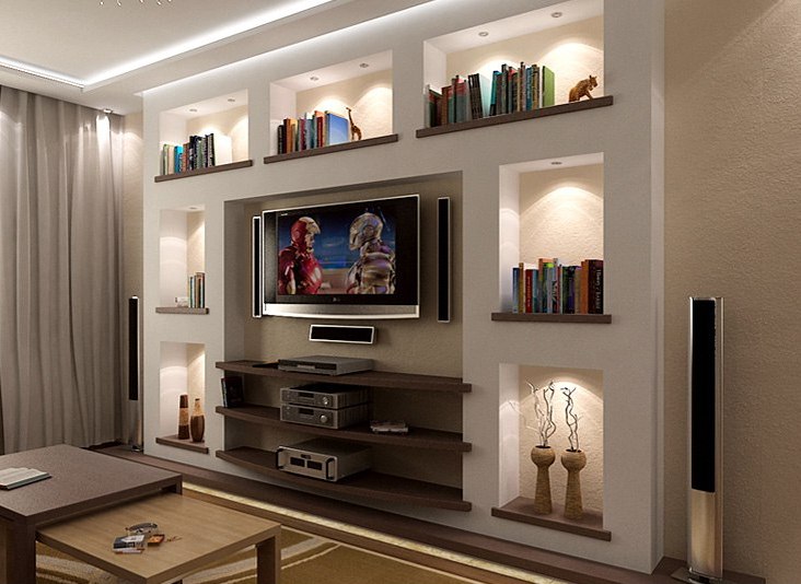 Auf der anderen Seite können die Regale aus Gipskarton nicht bewegt oder als Möbel verkauft werden. Im Gegensatz zu den TV-Schränke mit dem Einsatz von Regalen aus dem GCR sind mehr funktional. Zusätzlich können Wand- oder Strahler, LED-Lampen und Bänder installiert werden.