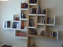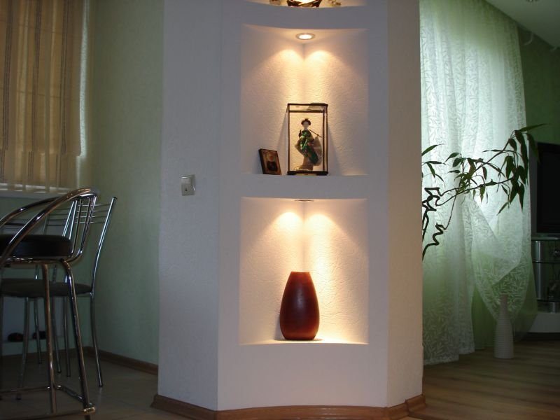 Eckregale sind haltbarer als gerade. Wenn die Wand stark gekrümmt ist, hat hervorragende Strukturelemente, können Sie eine Trockenmauer aus Trockenbau machen. Damit der Wohnraum nicht verschwindet, können Sie Nischen mit Regalen ausstatten. Sie können auch dekorativ oder funktional sein.