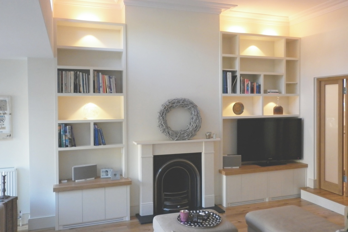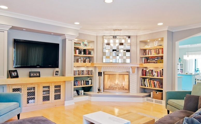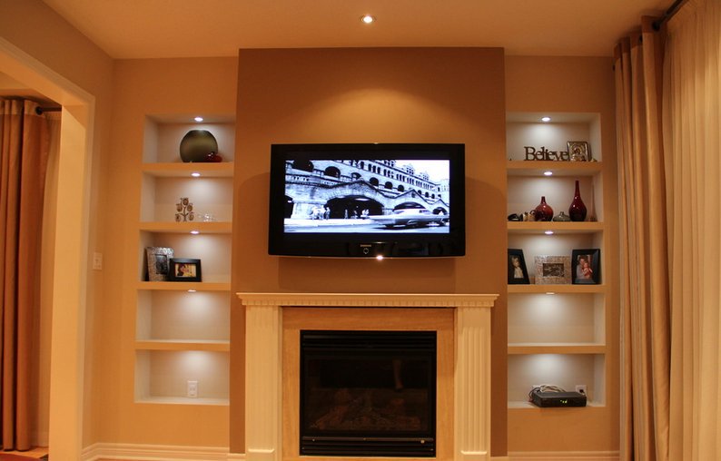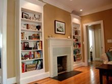 - Wenn die Wand Nischen oder herausragende Elemente der Gebäudestruktur hat, können Sie sie schlagen. Wenn ein Teil der Wand mit einem Kamin nach vorne gegeben wird, lohnt es sich, die geformten Nischen mit Regalen zu füllen.