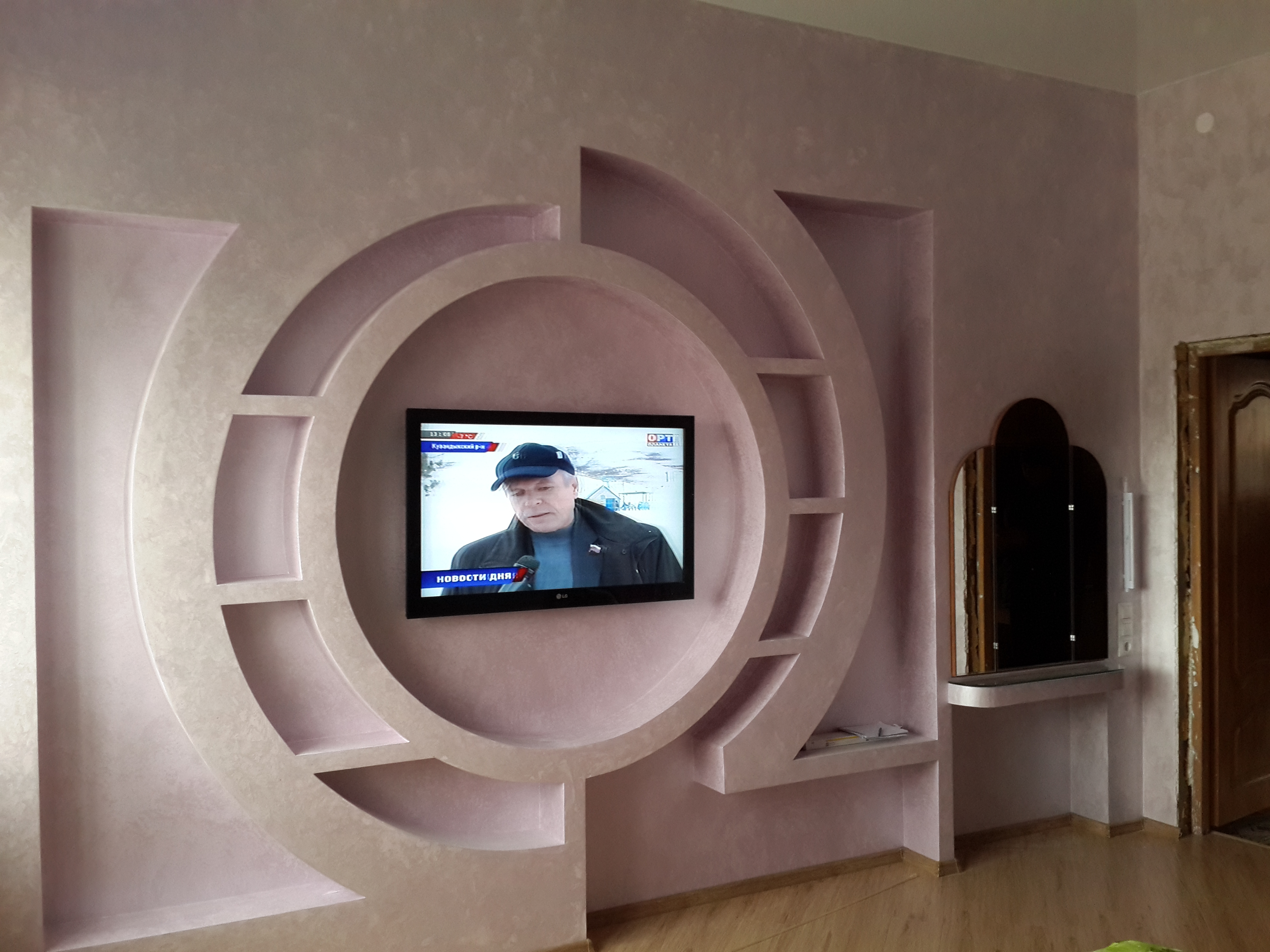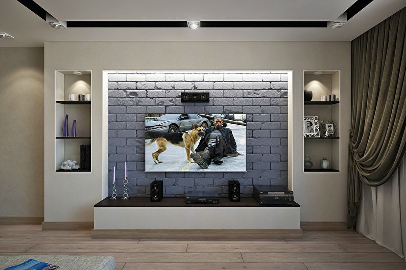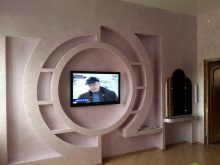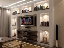 - Aus der Gipskartonplatte können Sie eine Nische für TV und Technik machen, ein ganzes Ensemble von Regalen montieren, die die Möbelwand ersetzen.