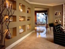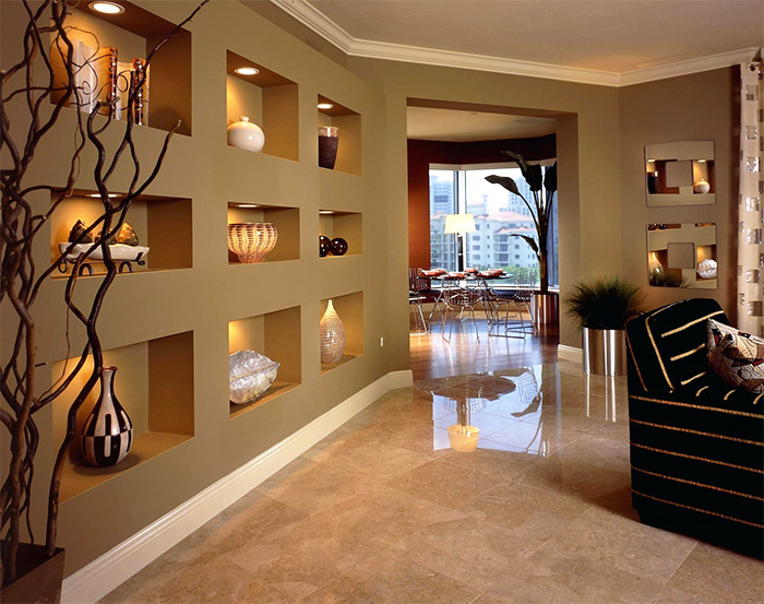 Trockenbau kann mit fast jedem dekorativen Material verziert werden. Es kann Tapeten, Putz, verschiedene Arten von Farben sein. Die Konstruktion kann mit dem gleichen Material wie die Wände beendet werden. Dann werden die Regale Teil der Wand sein. Sie können sie mit Material und Farbe hervorheben, um einen hellen Akzent im Innenraum zu setzen, den Raum visuell zu teilen oder anzupassen.