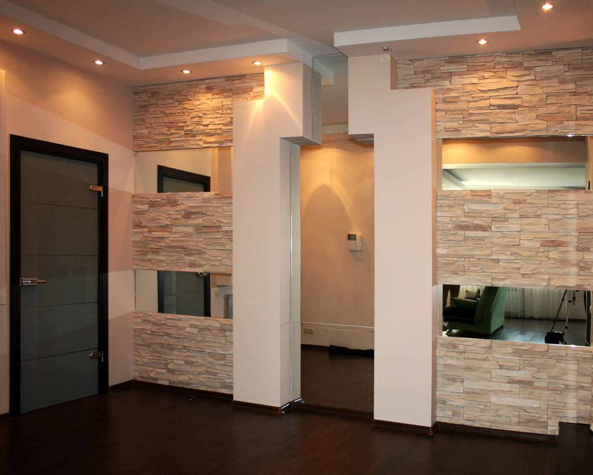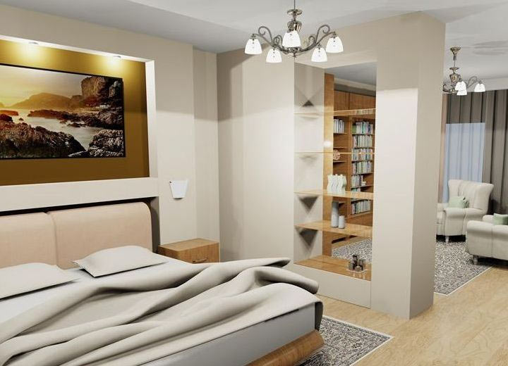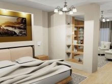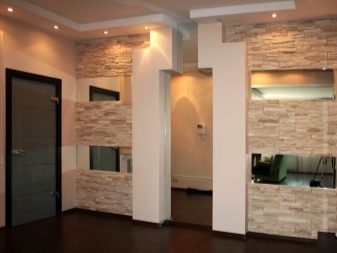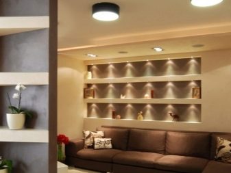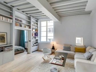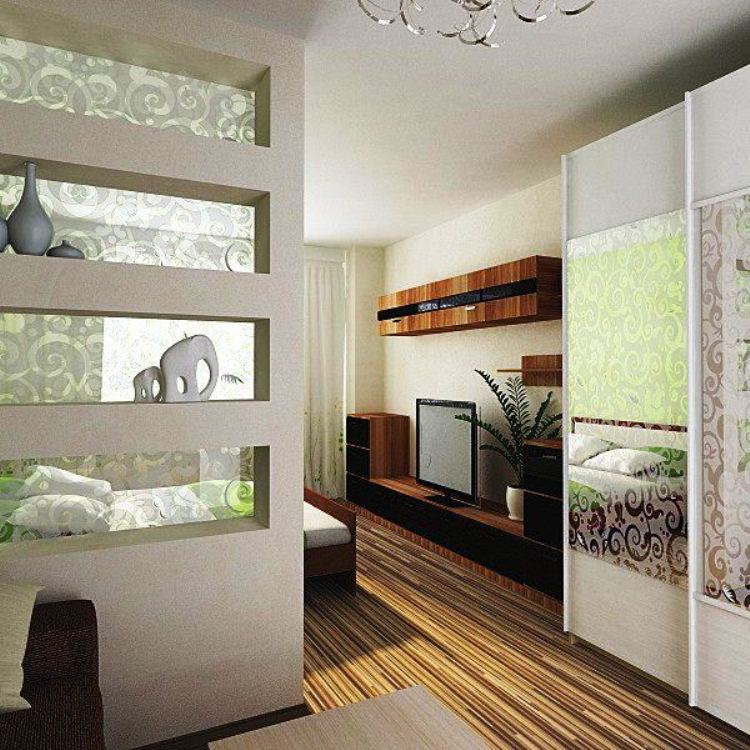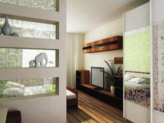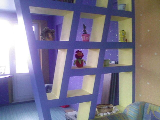 Wenn das Haus multifunktional ist, zum Beispiel, ist es ein offener Plan oder eine Kombination von Zimmern (Schlafzimmer und Wohnzimmer, Küche und Esszimmer), kann von Trockenbau Zonen Partitionen mit durch die Regale gebaut werden. Dadurch kann der Abstand begrenzt werden. Regale können zur Aufbewahrung oder zur Dekoration mit dekorativen Vasen verwendet werden. Diese Option ist für Studio-Apartments relevant.
