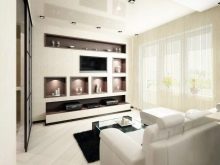 - Im Wohnzimmer am häufigsten errichtete zentrale Strukturen in der gesamten Wand. In ihnen ist es bequem, Nischen für TV zu organisieren, die normalerweise in der Halle platziert werden.