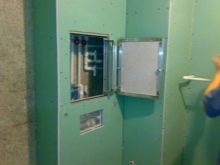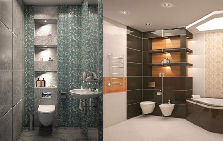 - Im Badezimmer und in der Toilette Wegen des begrenzten Platzes ist es schwierig, Regale und Schließfächer aufzuheben. Es ist einfacher, das Problem der Raumorganisation mit Hilfe von Konstruktionen aus feuchtigkeitsbeständigem Gipskarton zu lösen.
