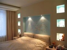 - Im Schlafzimmer Irgendwelche Lösungen sind möglich. Regale können ausschließlich dekorativ oder funktional sein. Viel hängt von der Fläche und den Dimensionen der Möbel ab.