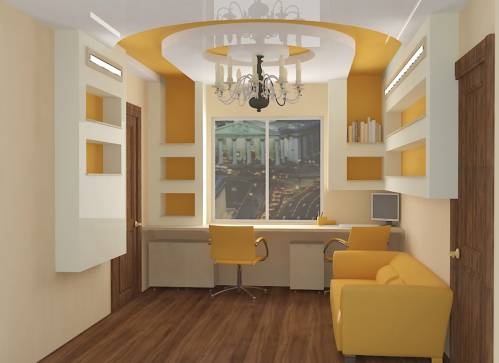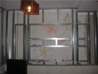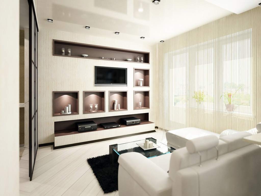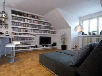Das Vorhandensein von Regalen um die Fensteröffnungen herum und entlang der Wände verringert den Geräuschpegel nicht. Designs aus Gipskartonplatten ermöglichen es Ihnen, Möbel zu sparen (Regale, offene Regale aus anderen Materialien, Beistelltische und TV-Tische). Aber es gibt einen Nachteil. Um die Struktur zu bewegen, müssen Sie mit anschließenden Reparaturarbeiten demontieren.