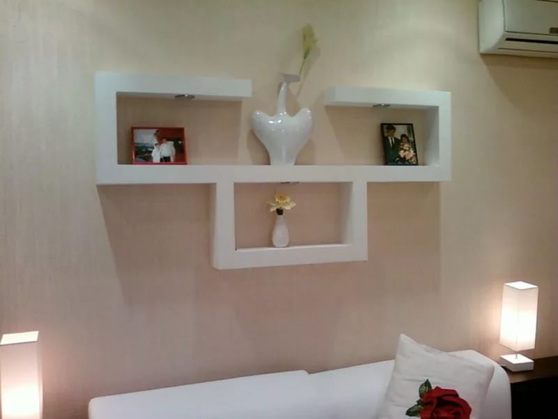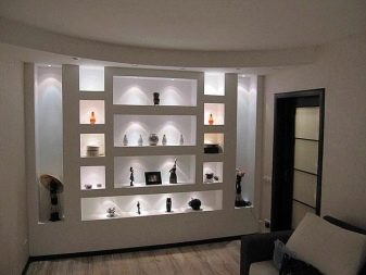 Alle Regale der Trockenbauwände können in zwei Hauptgruppen unterteilt werden: dekorativ und funktional. Die ersten oft offen, haben einen leichten Rahmen.Sie haben verschiedene dekorative Elemente des Innenraums (Vasen, Souvenirs, Fotografien).