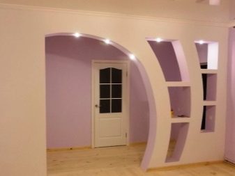 Wenn die Regale lang (mehr als 1 m) geplant sind, werden vertikale Stürze empfohlen. Längere Regale halten der Belastung möglicherweise nicht stand. Wenn sie extrem dekorativ und schmal sind, können Sie ohne Jumper auskommen. Die Fassade und die Seitenteile der Struktur können mit gewölbten Trockenbau beendet werden. Es ist billiger. Auf die Stärke der Struktur wird nicht auswirken, aber es wird sparen. Es ist interessant, konkave Regale zu sehen, die aus dem gewölbten GCR gebaut sind.