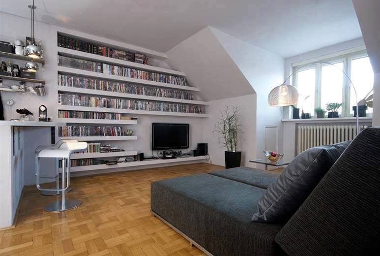 - Ungewöhnlich niedrige Decken, andere Formen von Räumen erschweren die Möbelauswahl. Regale und Schränke können aus Gipskartonplatten hergestellt werden.