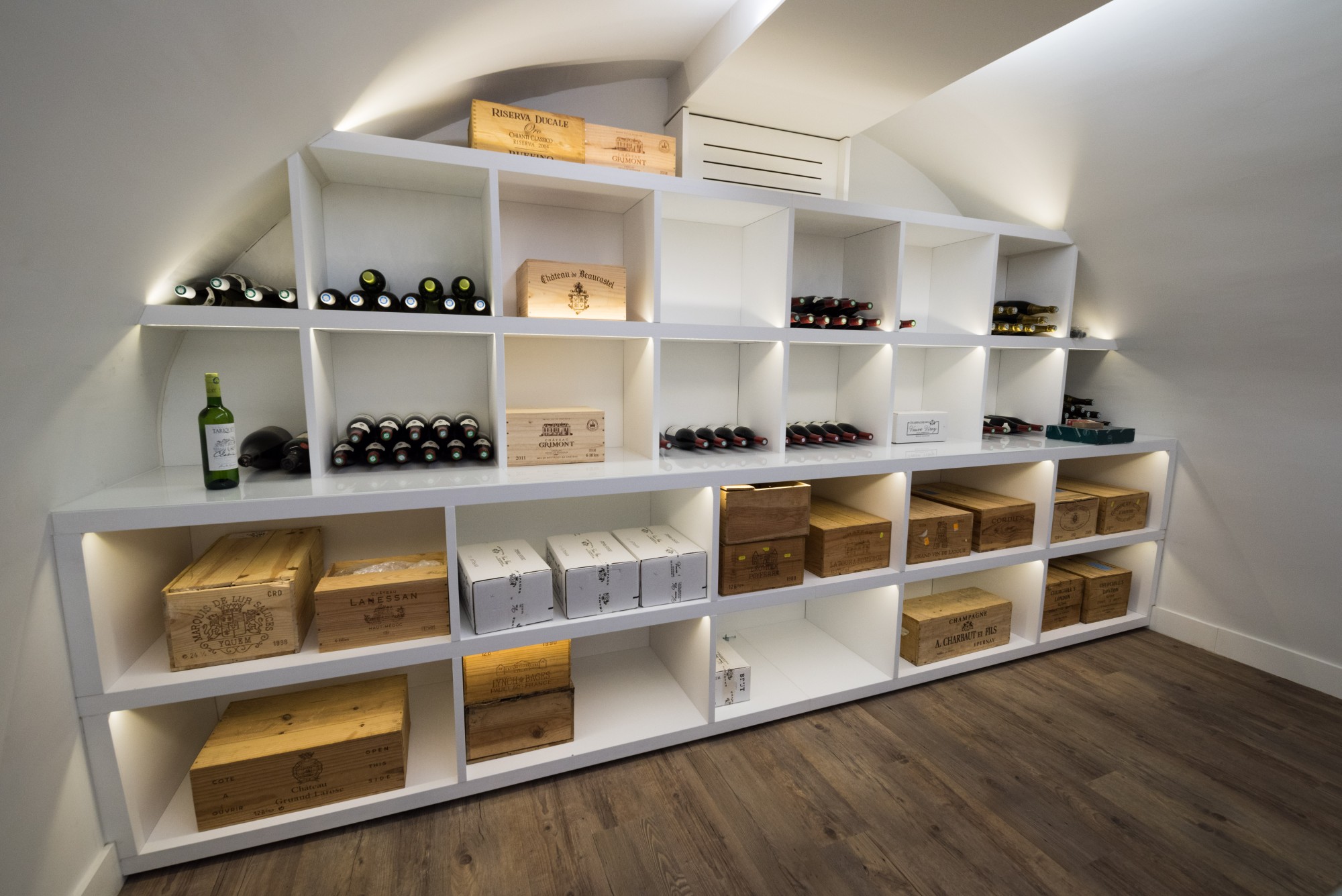 Mit Hintergrundbeleuchtung schön aussehen. Die Konfiguration der Regale kann linear oder gemustert sein, abhängig von dem gesamten Stil des Inneren eines bestimmten Raums.