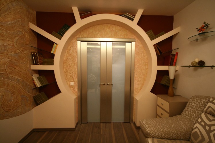 Trockenbau ermöglicht es Ihnen, Strukturen in verschiedenen Formen zu bauen. Die Regale selbst können jede Form haben (sogar asymmetrisch und geneigt). Alles ist begrenzt durch den Raum des Raumes und die Vorstellungskraft des Designers. GKL wird oft verwendet, um Einbauschränke und Wände zu erstellen. Dadurch können Sie eine Struktur erstellen, die die Möbelwand ersetzt.