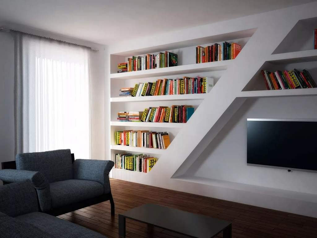 Es ist nicht immer möglich, ein geeignetes Eckregal zu finden. Dieses Problem ist perfekt gelöst Regale aus Gipskarton. Sie können ihre Größe und Form anpassen. Offene Regale reduzieren nicht den Raum des Raumes und passen organisch in den Innenraum. Besondere Aufmerksamkeit erfordert Gipskartonregale unter dem Buch. Gedruckte Produkte wiegen viel, Bücherregale müssen erhöhte Belastung berücksichtigen. Da die Gipskartonplatte nicht so dauerhaft ist wie Holz, sollten die Regale selbst nicht groß sein. Das Maximum sind sie für 10 Bücher ausgelegt.