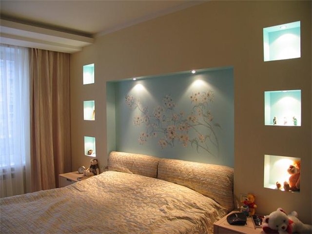 Wenn es geplant ist, die Struktur mit farbiger Farbe zu malen, ist es empfehlenswert, die Nische leichter zu machen.. Es wird sowieso schattiert sein. Um dies zu tun, können Sie etwas Farbe aus dem Weiß der gleichen Marke verdünnen. Alternativ können Sie einzelne Regale oder Strukturelemente dekorieren. Für die Fertigstellung lohnt es sich, Stein, Spiegel, Buntglas oder Kunststoff, Imitation von Buntglas zu verwenden und vieles mehr.