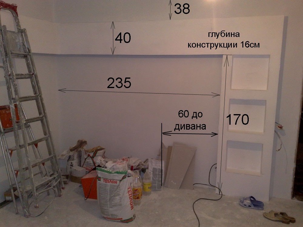Der nächste Schritt ist das Legen der Hintergrundbeleuchtung, wenn es geplant ist. Alle Drähte sind in einer Kunststoff-Wellpappe versteckt. Nach den Schrauben oder flüssigen Nägeln Trockenbau befestigen. Das Design ist fertig, Sie können bis zum Ziel gehen.