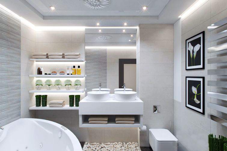 Eine ähnliche Technik kann auf das Badezimmer angewendet werden, indem eine Box mit Regalen und Nischen ausgeführt wird.