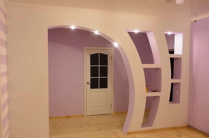 Trockenbau ist weit verbreitet. Sie beschneiden die Wände und Decken, verdecken Fehler, errichten verschiedene dekorative Strukturen. Zum Beispiel, montierte Regale, spielen an den Ecken, Fenster und Türöffnungen.
