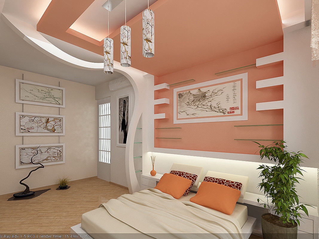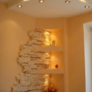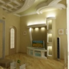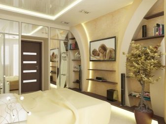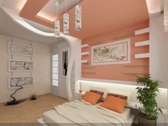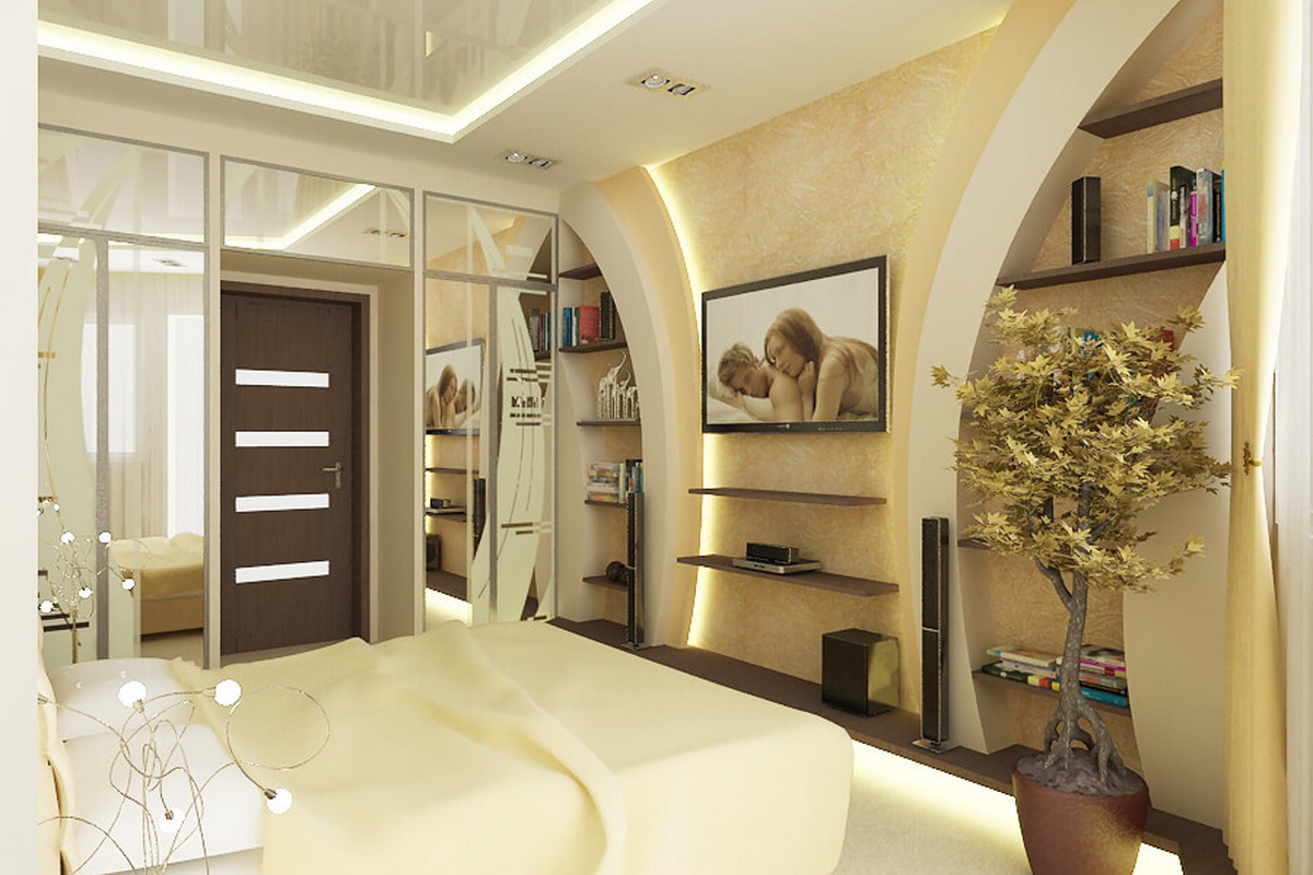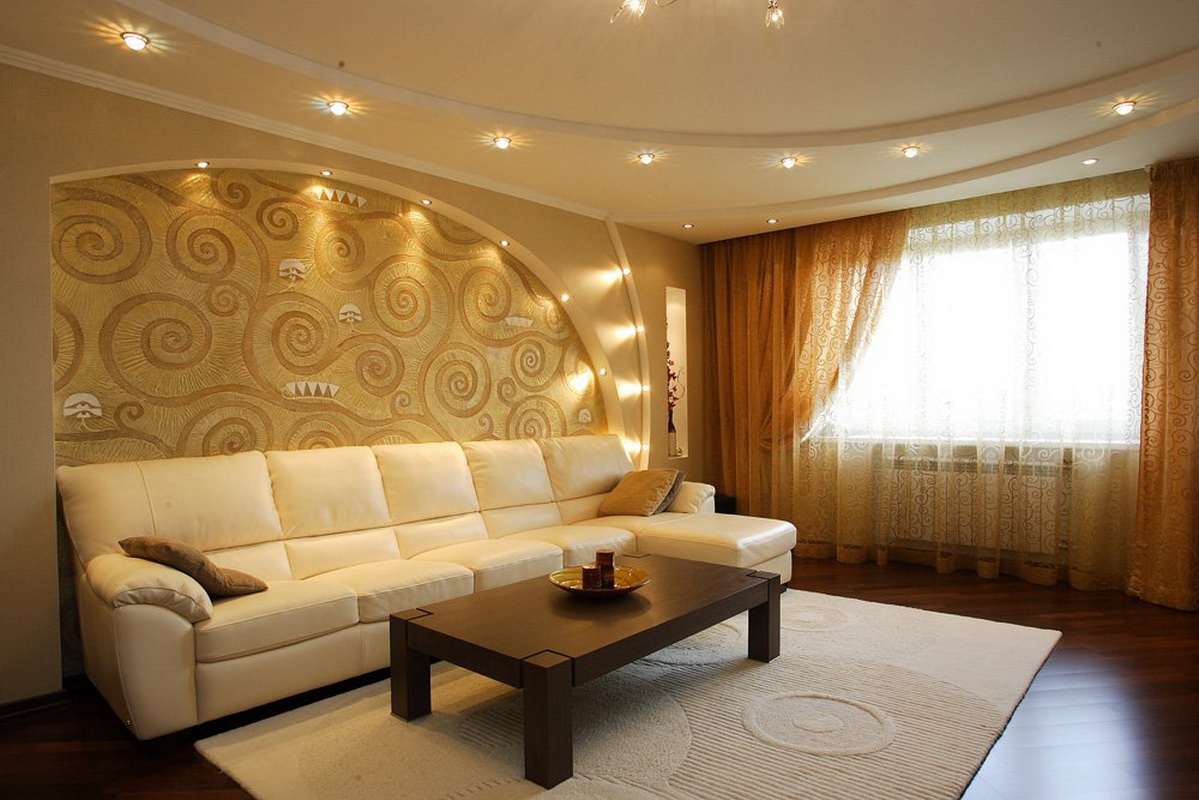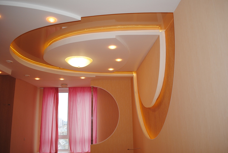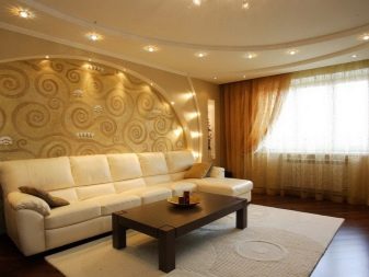 Komplexe Konstruktionen von Trockenbaukonstruktionen ziehen sofort Aufmerksamkeit auf sich, verleihen dem Wohnraum eine neue Form und verändern ihn bis zur Unkenntlichkeit. Das Interieur wirkt reicher und raffinierter. Glatte flexible Linie, eingebaute Beleuchtung geben eine Atmosphäre der Wärme und des Komforts.