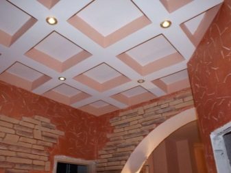 Fliese - eine weitere attraktive Option für die Veredelung von Gipskartondecken. Aber hier ist eine Bedingung - Es ist notwendig, die gesamte Oberfläche der Gipsdecke mit einer Grundierung vorzubehandeln. Ignoriert man diese Phase, dauert die Fliese nicht lange und fällt jeden Moment ab.