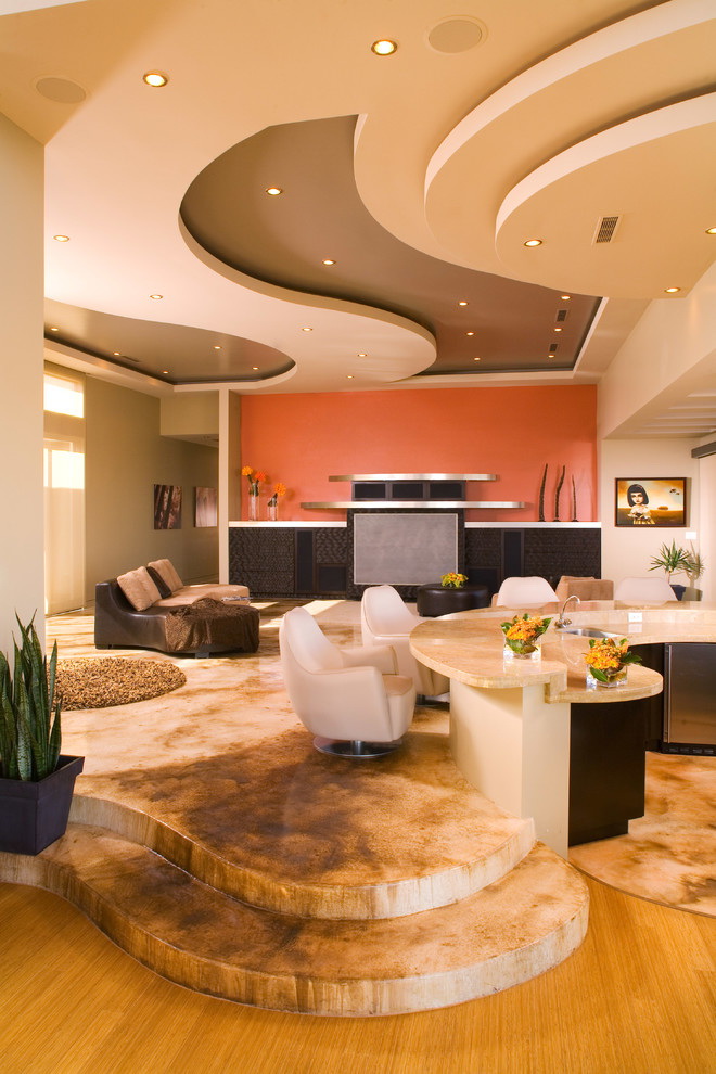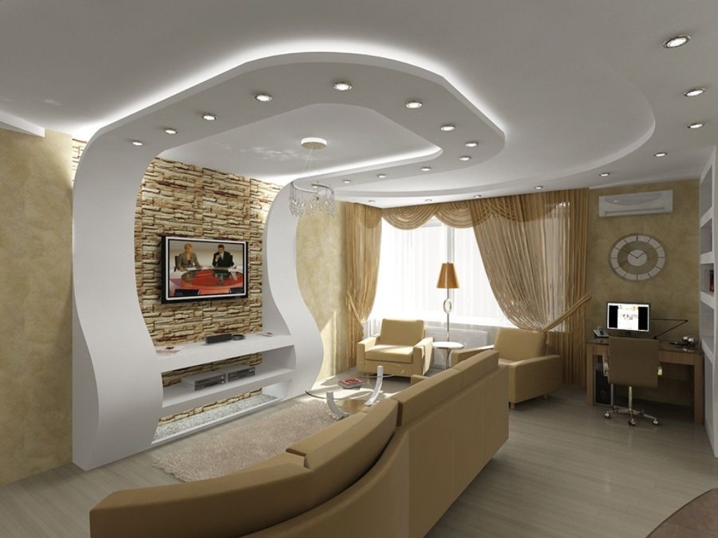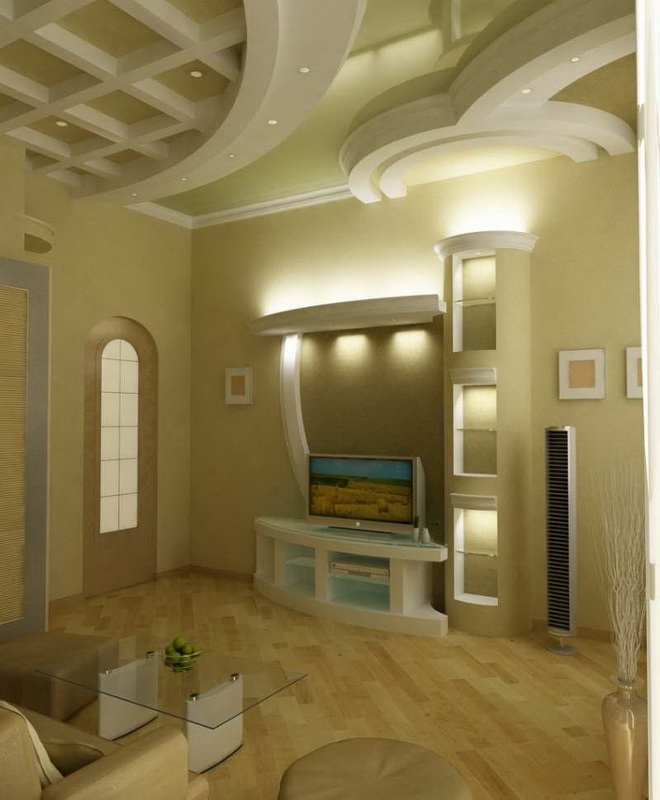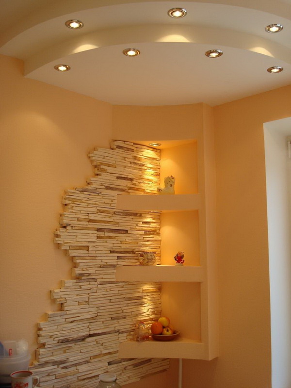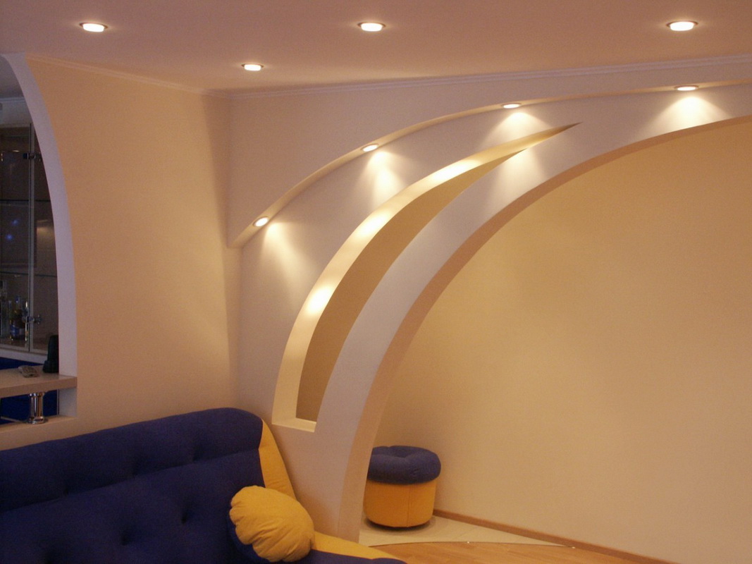 Trockenbau ist nicht nur in der Lage, Ihre Decke zu nivellieren, sondern verändert auch drastisch Ihr Interieur.. Die Decke hat eine ungewöhnliche Form mit Beleuchtung, Wandpaneelen, einem Kamin, einem Bogen, einem Regal, einer Trennwand und vielem mehr - das sind ausgezeichnete Lösungen, um Wohnbereiche zu identifizieren, die sie funktionaler machen.