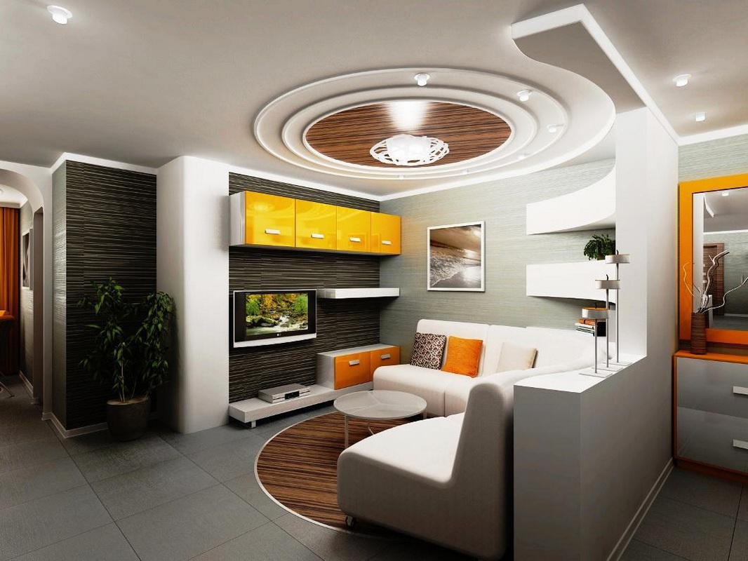 Round Shaped Decke - die beste Option, um das Zentrum der Wohnung zu markierenzum Beispiel, wo es ein Tisch, ein Sofa oder ein Platz mit der größten Menschenmenge sein soll.
