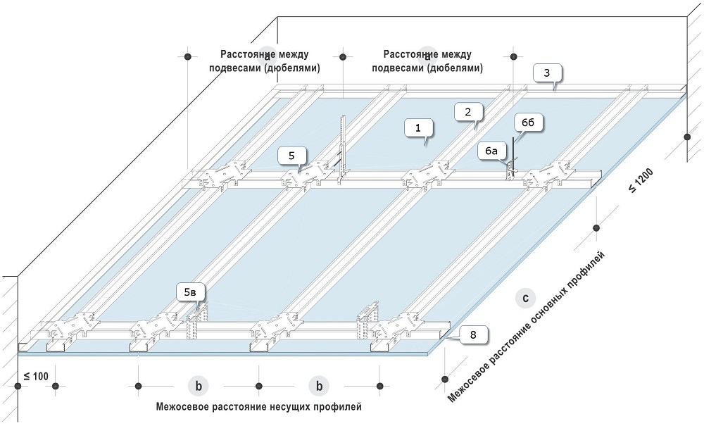 - Dann ist es notwendig, das erforderliche Volumen für die tragenden Deckenprofile zu berechnen. Dieses Gerät ist sehr wichtig. Zum Beispiel, nehmen Sie eine Lücke von 50 Zentimetern in der Länge - der Abstand, dass Profile nacheinander festgelegt werden. Wenn ein Trockenbaublatt entlang der Länge des Raumes befestigt wird, beträgt die Größe eines Standardblattes 2500 mm, daher fallen die Ränder auf die tragenden Profilelemente.