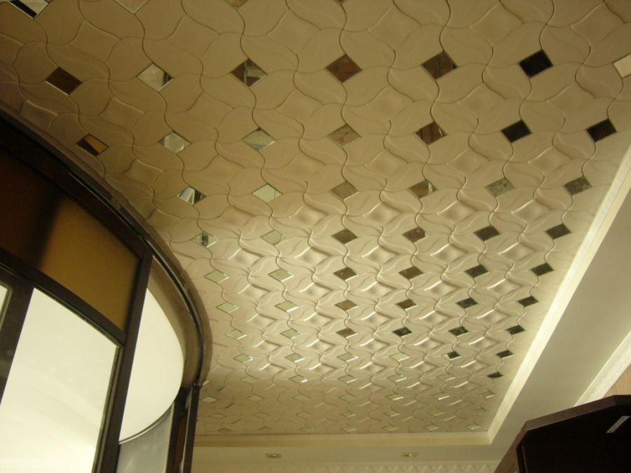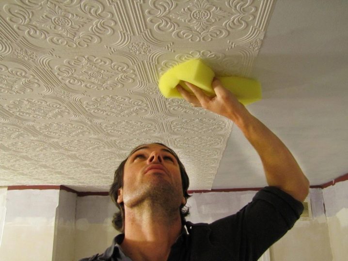 Deckenprodukte werden selten mit Keramikfliesen beschnitten, In diesem Fall wird ein Material wie Polyurethan oder Polystyrol verwendet.. Solche Materialien bleiben einfacher und schneller haften.