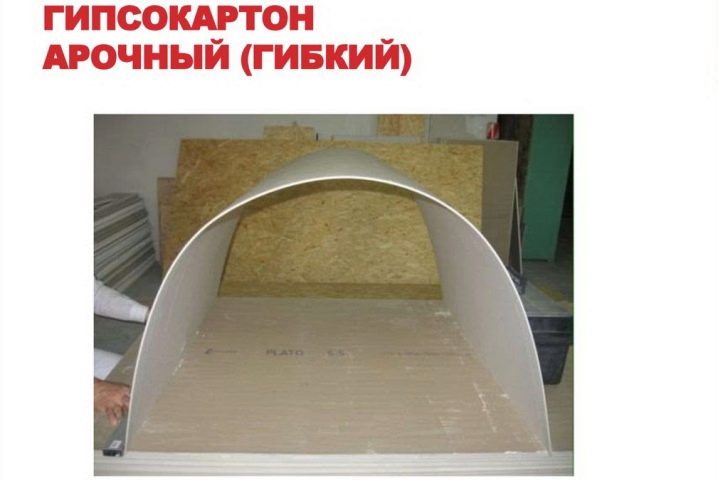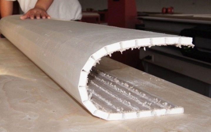 Gewölbte Trockenbauplatten haben die kleinste Dicke der zuvor vorgestellten Arten - weniger als sechs Millimeter. Verwendet, um verschiedene Arten von Designs von verschiedenen Kurvenradien und gekrümmten Linien zu reproduzieren.